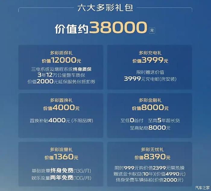 还有一些其它的权益,像质保礼,三电系统及增程系统终身质保,3年12万公里整车质保,价值2000元的延保服务抵扣券,还有限时赠送,价值3999元的充电桩,至低0首付,至高5年超长贷,至高贴息8000元,基础流量终身免费,娱乐流量两年免费,还送贴膜,金卡10年权益,终身免费车辆体检等。