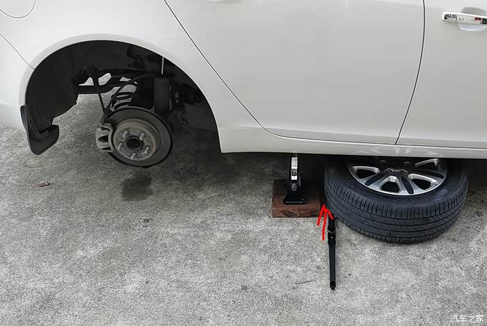 找两块砖垫着,把右后轮架起,垫砖是这样空间稍高一点好施工一点
