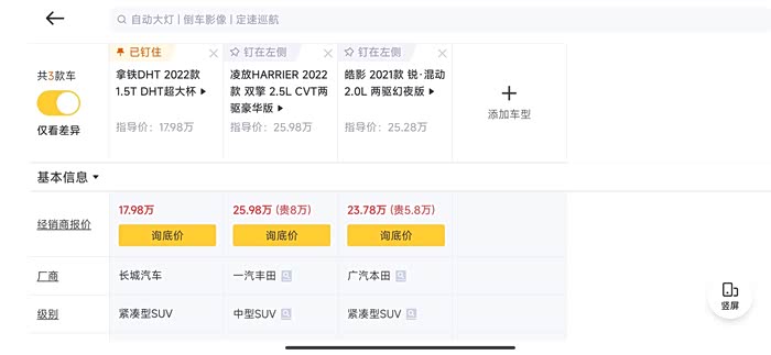 凌放最贵,毕竟定位是介于荣放(威兰达)和路放(汉兰达)中间的位置,中型SUV,但是皓影裸车价也要优惠后大概23.78万了,比拿铁贵了5万多,即使拿铁涨了1万的价格,也贵了4万多了,看看数据上的差异吧