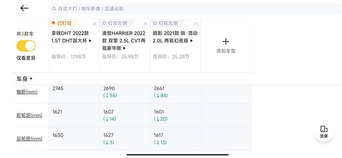 车身尺寸对比,都很接近,凌放作为中型SUV也就车长比拿铁多了87MM,轴距,前轮距,后轮距等其他数据也都是拿铁完胜
