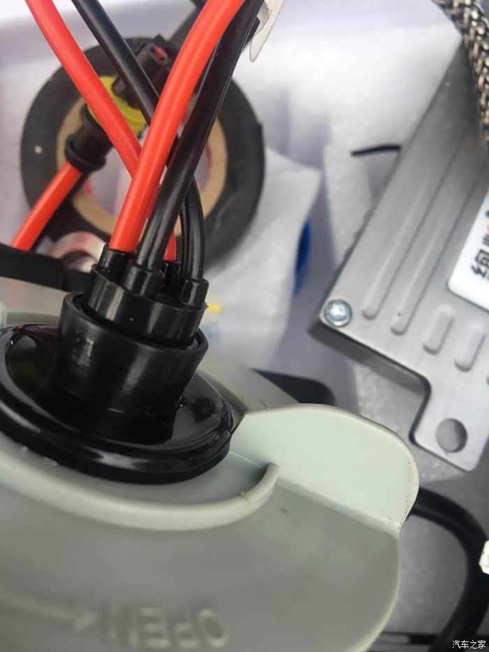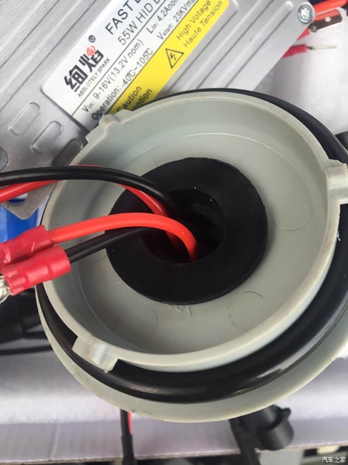 睿骋的近光,红白线为正极,灰色线负极,对插就行了,为了怕红色正极接触,用绝缘胶带给包了一下,负极作为打铁,就无所谓了…