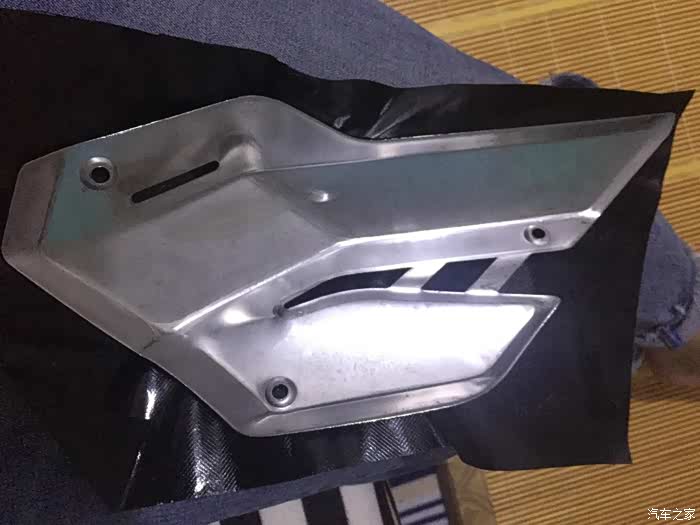 晚上又拆了排气管外罩,感觉像块大铁皮,不是很上眼,所以用之前贴车剩下的一点仿碳纤维贴纸来包裹它,感觉立马霸气了...哈哈,,,纯手工,太难贴了,因为折角太多,最后还是被我拿下,一身汗...