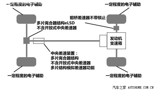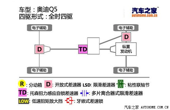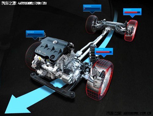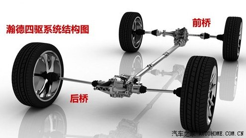 这个系统就有点像奥迪Q5的quattro系统了,动力从发动机发出后通过变速箱传到前差速器和中央差速器。前差速器将动力直接传给前轴驱动,中央差速器将动力传给传动轴再到后桥驱动后轮