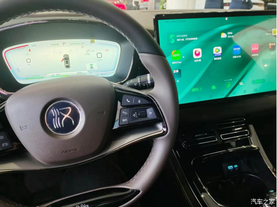 试坐下,内饰方面感觉跟22款的没有特别大的区别。依旧是品字型的中控台,可以触控操作的中控大屏。展车已经有爱奇艺、腾讯视频、B站之类的APP,都是我老爱用的APP。方向盘没有什么变化,握感依旧很不错。