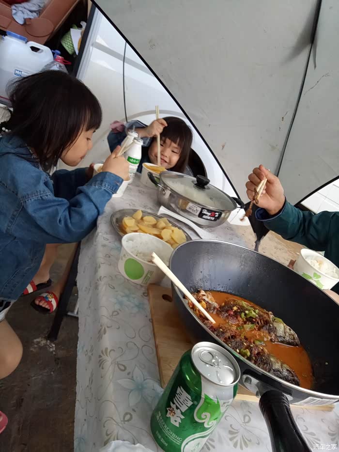 2大2小,晚饭就是三个菜应付足够了!户外露营最好每餐不剩,方便收拾。