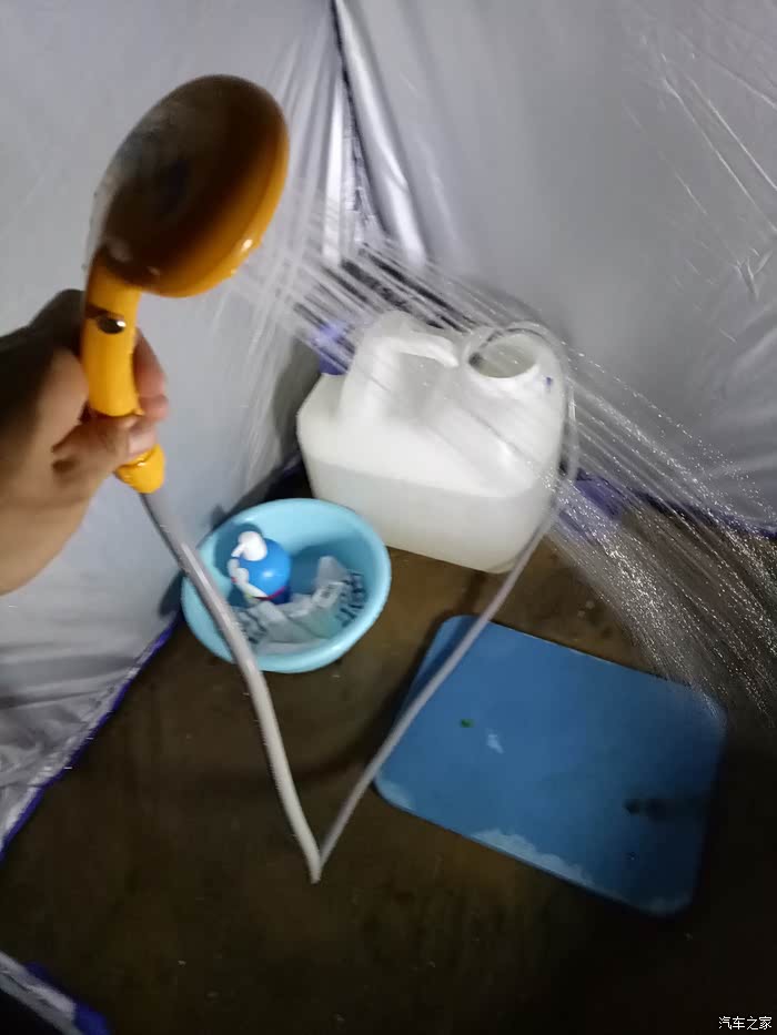 这是在某宝淘到的淋浴器,插上车内点烟器就行,水桶里装上热水(营地里有免费热水提供)。