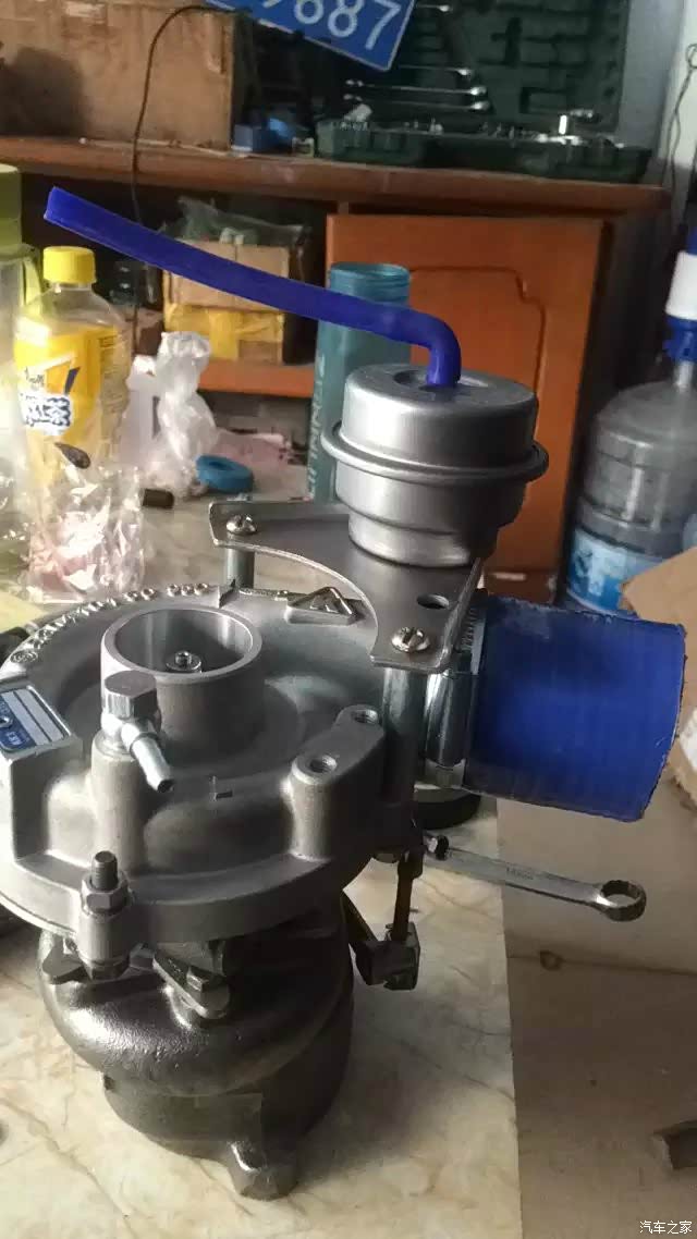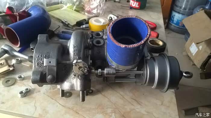 改造好的 增压机头,高压口向上,这一下子解决了很多问题,管道走向,与车内太近,安装的难度,一并解决了不少小问题。