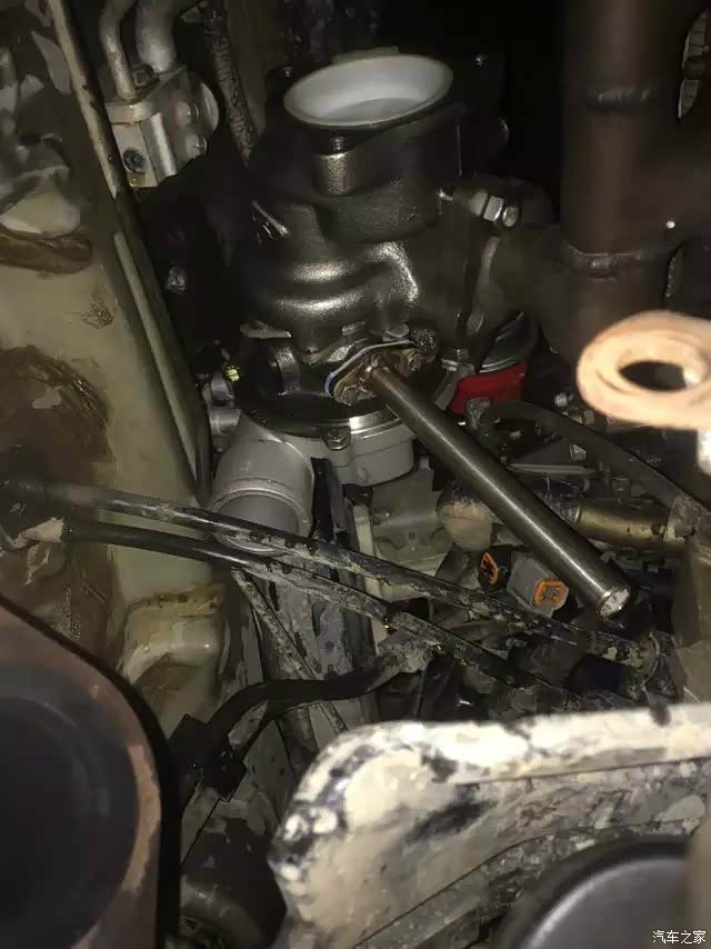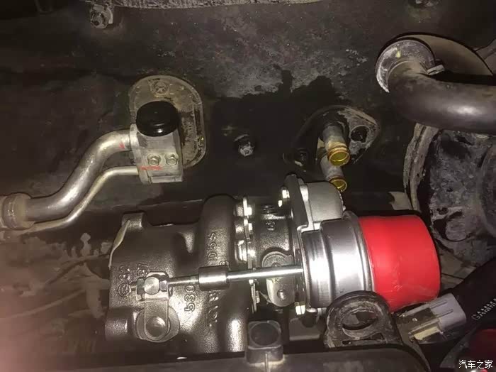 涡轮上车后本打算高压力口朝下,管道做U型转到上面来,但发现距离太紧凑了,发动机抖动的时候力道挺大,高压力口后面刚好是一条钢梁,考虑不能切钢梁···哎麻烦。