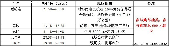 汽车之家携手东风本田2013年第一季看车团,该活动包含东风本田全车系车型,活动优惠让利直接底价,现场购车除享受现金优惠外额外可赠送丰富的用品礼包。当天网友不仅可获赠签到礼,试驾礼,还有购车抽豪礼,中奖率100%,让您惊喜不断。通过本帖子报名的成功购车的前8名购车网友更可享受由汽车之家送出的500元加油卡。仅限活动当天,还等什么?