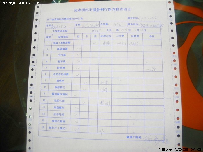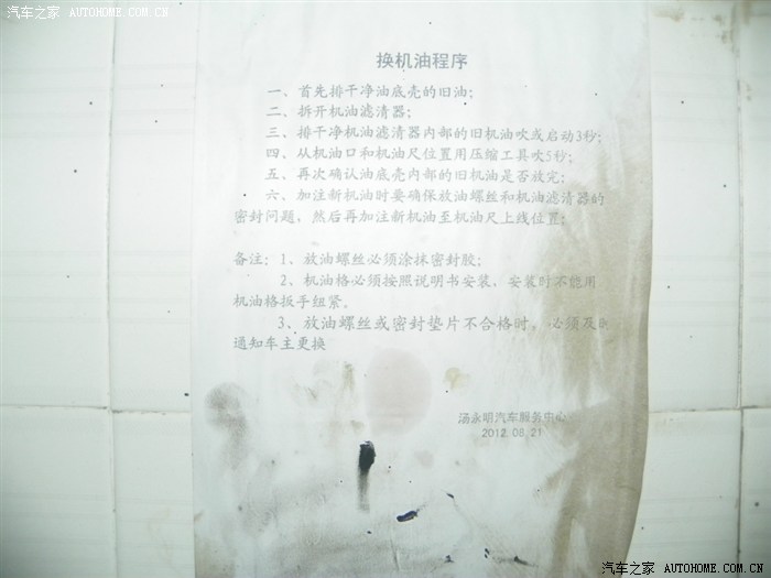 出厂就有怠速方向盘抖动现在似乎越来越大了,早上发动时间需要2秒左右,烦。顺便检查一下机油尺,数量都是没有少,可是用餐巾纸一检查油渍,坏了,达到二级标准了,这个不能忽视,赶紧保养了。
