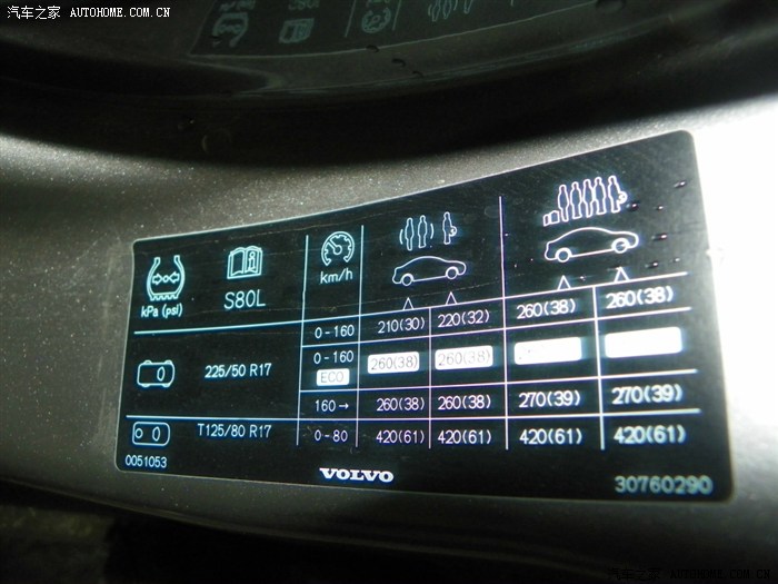 轮胎气压非常关键,门框上面有明显标签:160码以内前轮需要220bar,后轮210bar.这是空车状态。这个对舒适性影响巨大,沃尔沃新车后减震器硬就是后轮气压是280bar,严重超出范围了,估计是厂家怕气压不足。