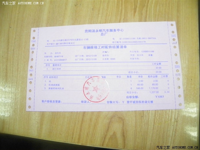 这次保养总共费用:1257元。