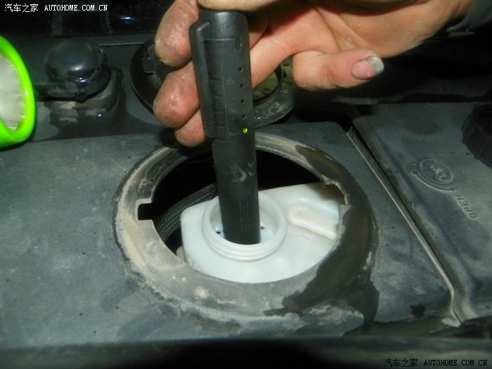 加进去6L新机油以后发动1分钟以后再次检查机油尺,在这个位置。记住千万不能超出机油尺上限的。