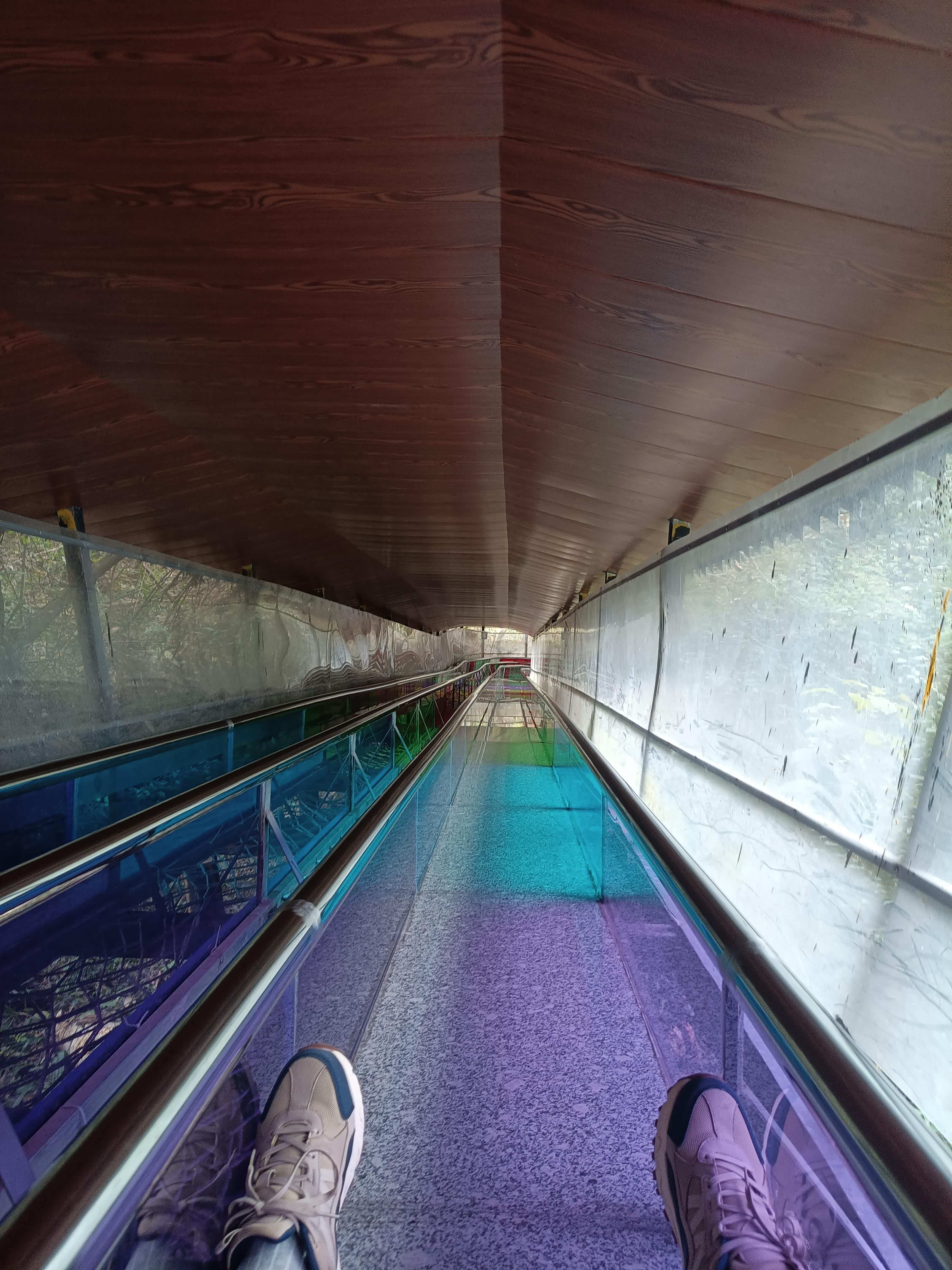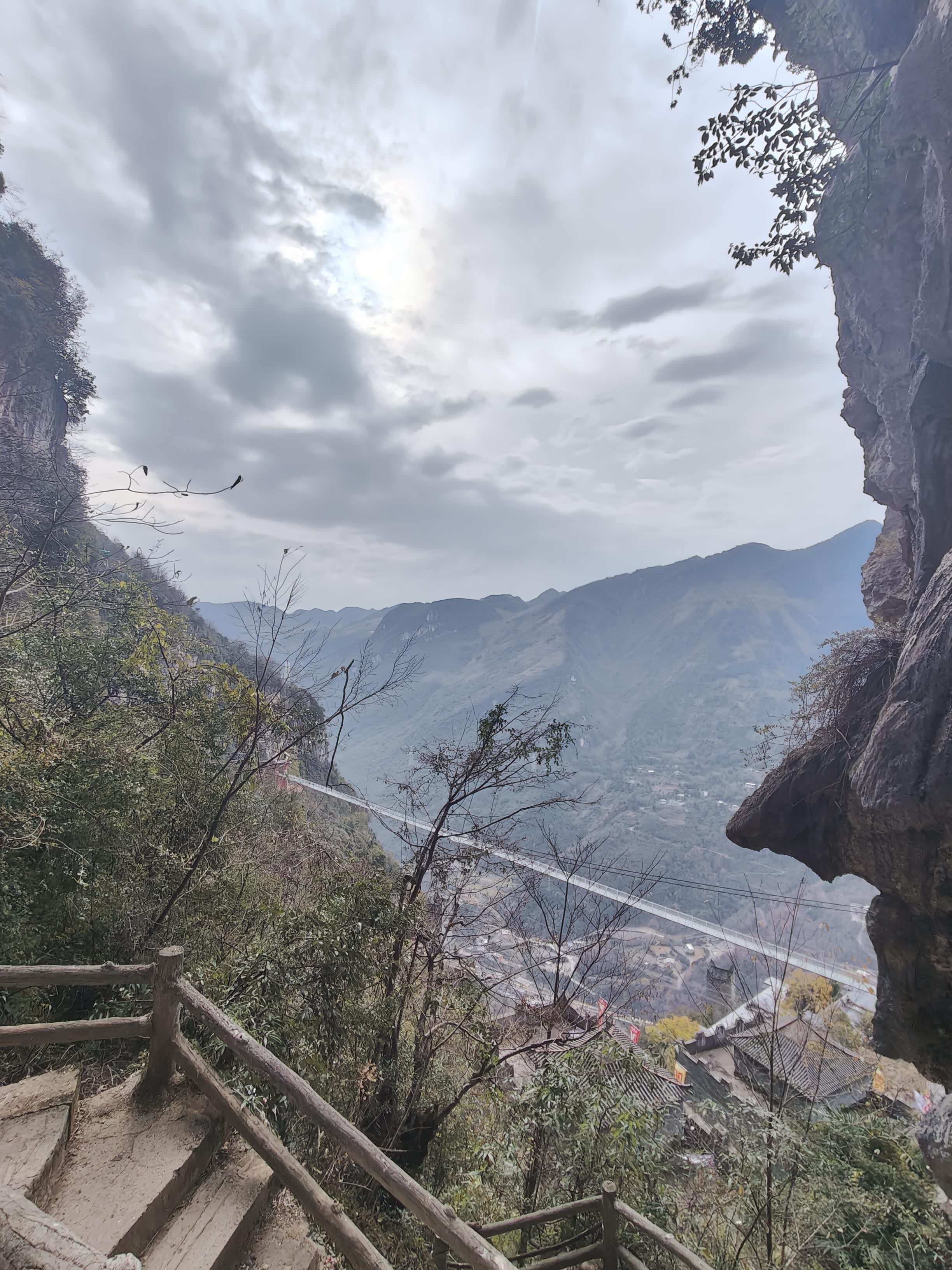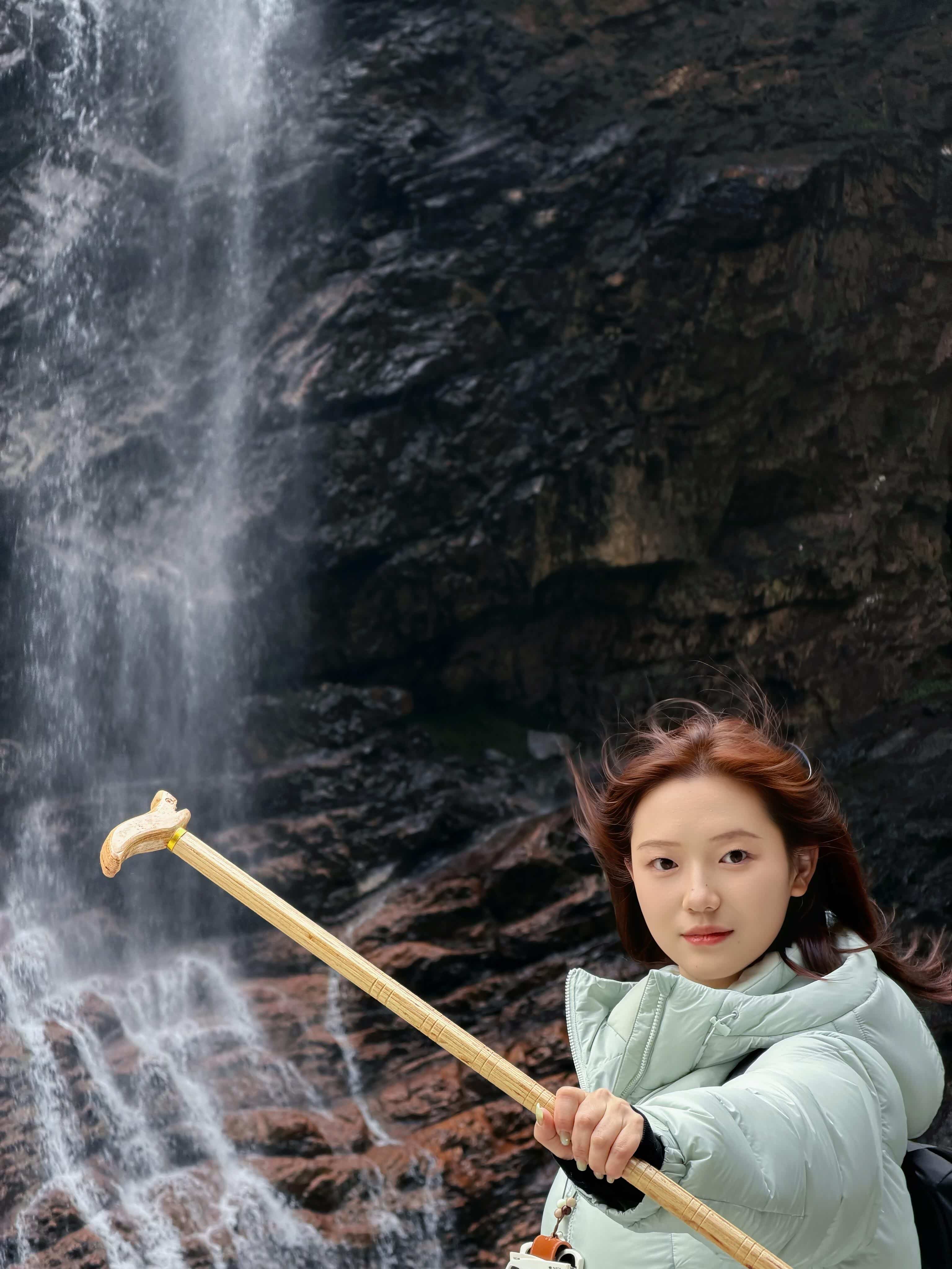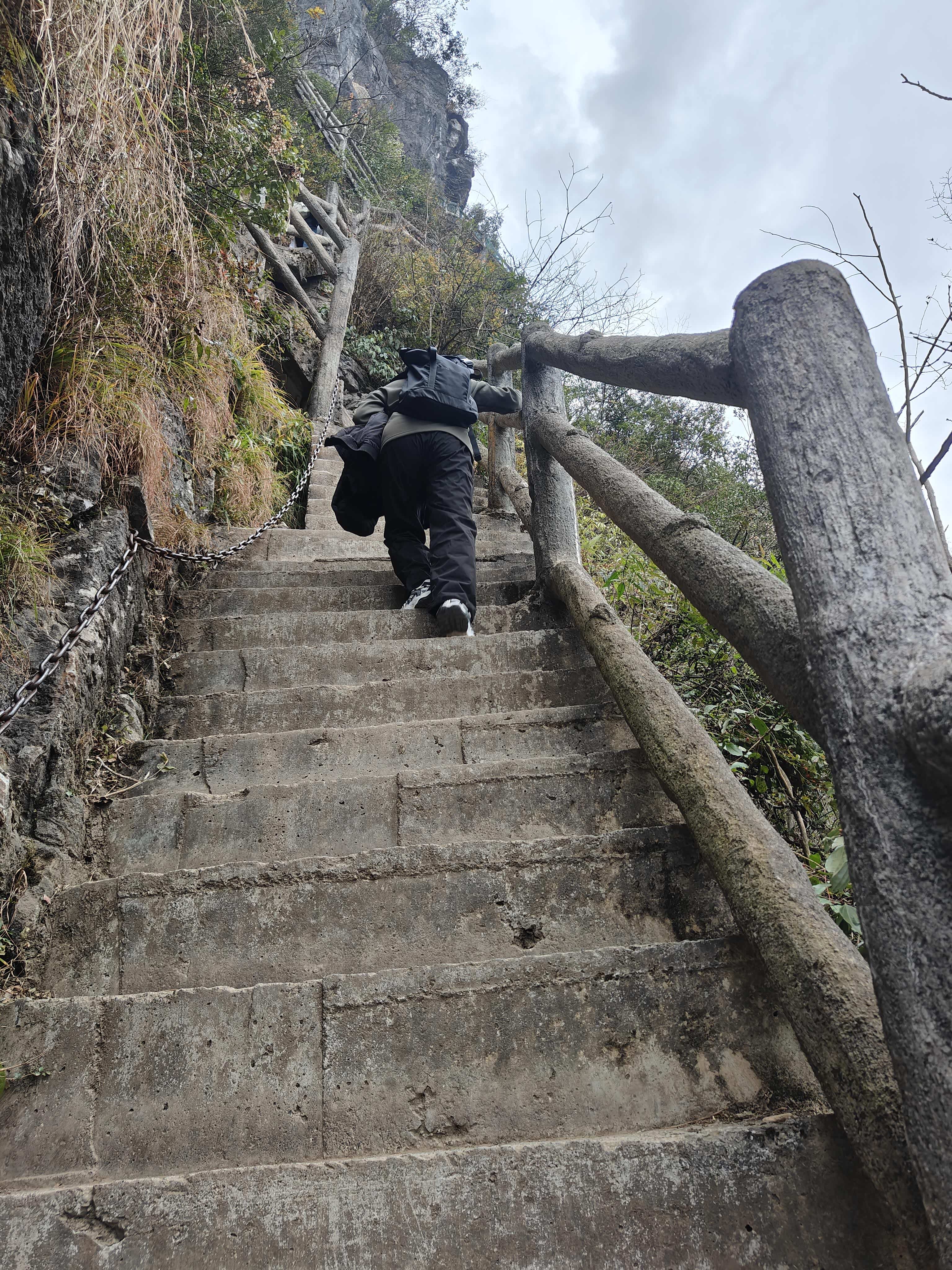 爬到半山腰的时候,遇到了传说中的绝壁栈道和天梯,那坡度陡得简直离谱,目测得有七八十度,往下看就是悬崖,腿肚子都打颤。老婆吓得紧紧抓着我的胳膊,一步都不敢挪。这时候我才庆幸听了攻略的话,带了登山杖!两根手杖往地上一撑,瞬间感觉省力不少,就像给双腿加了个缓冲器。手套也派上了大用场,有的地方没有台阶,得抓着铁链往上爬,要是没戴手套,估计手早就磨起泡了。