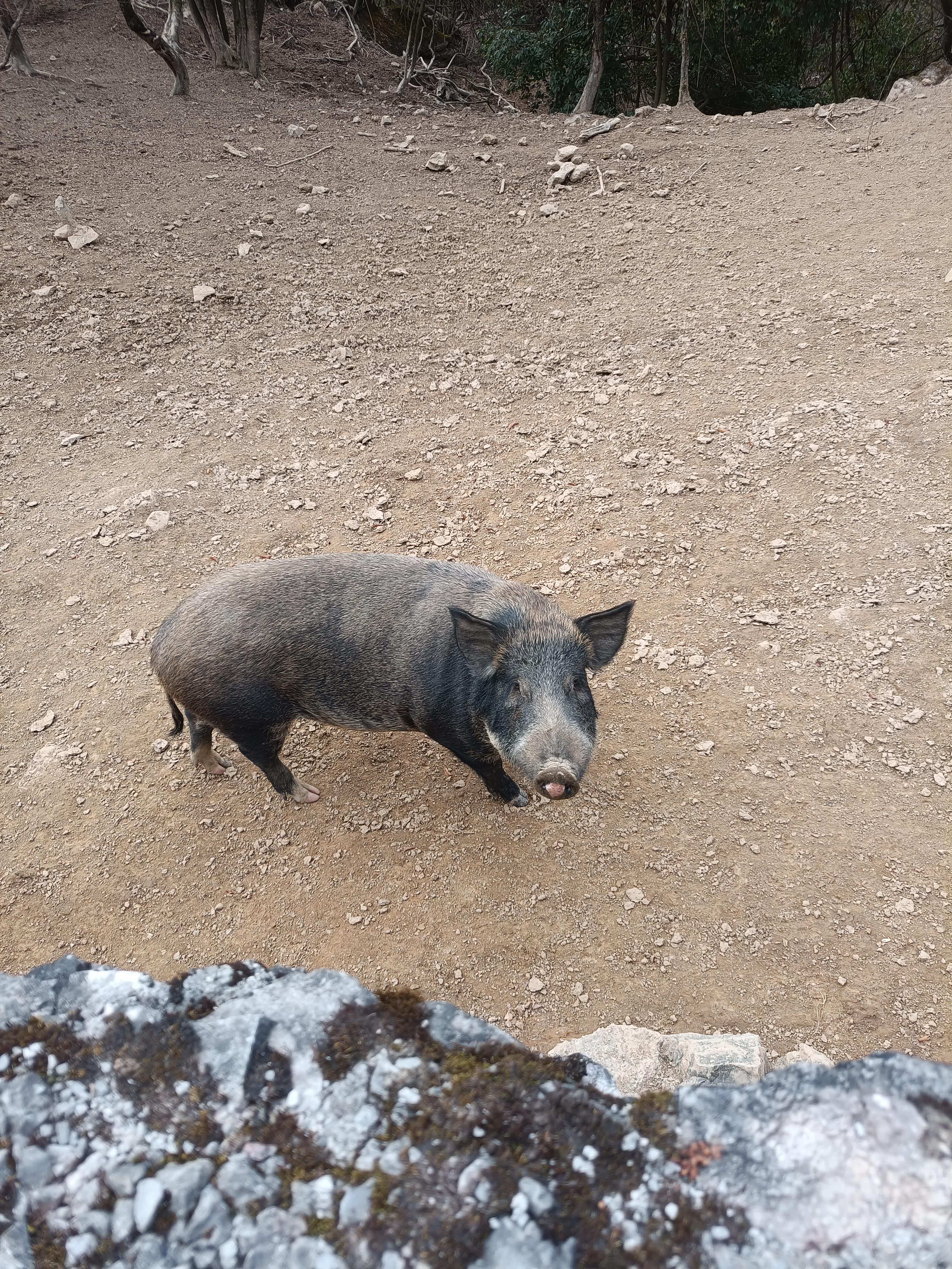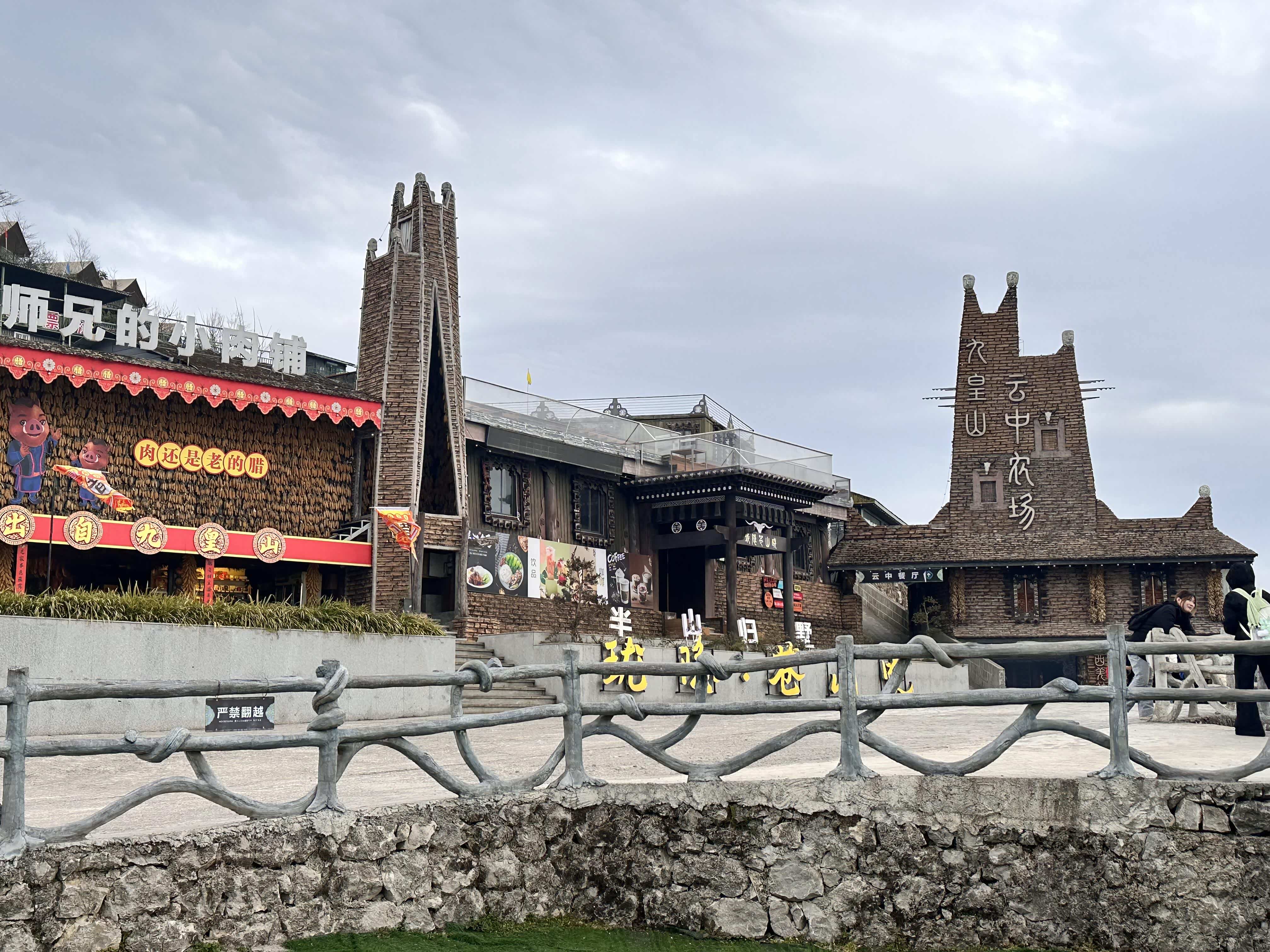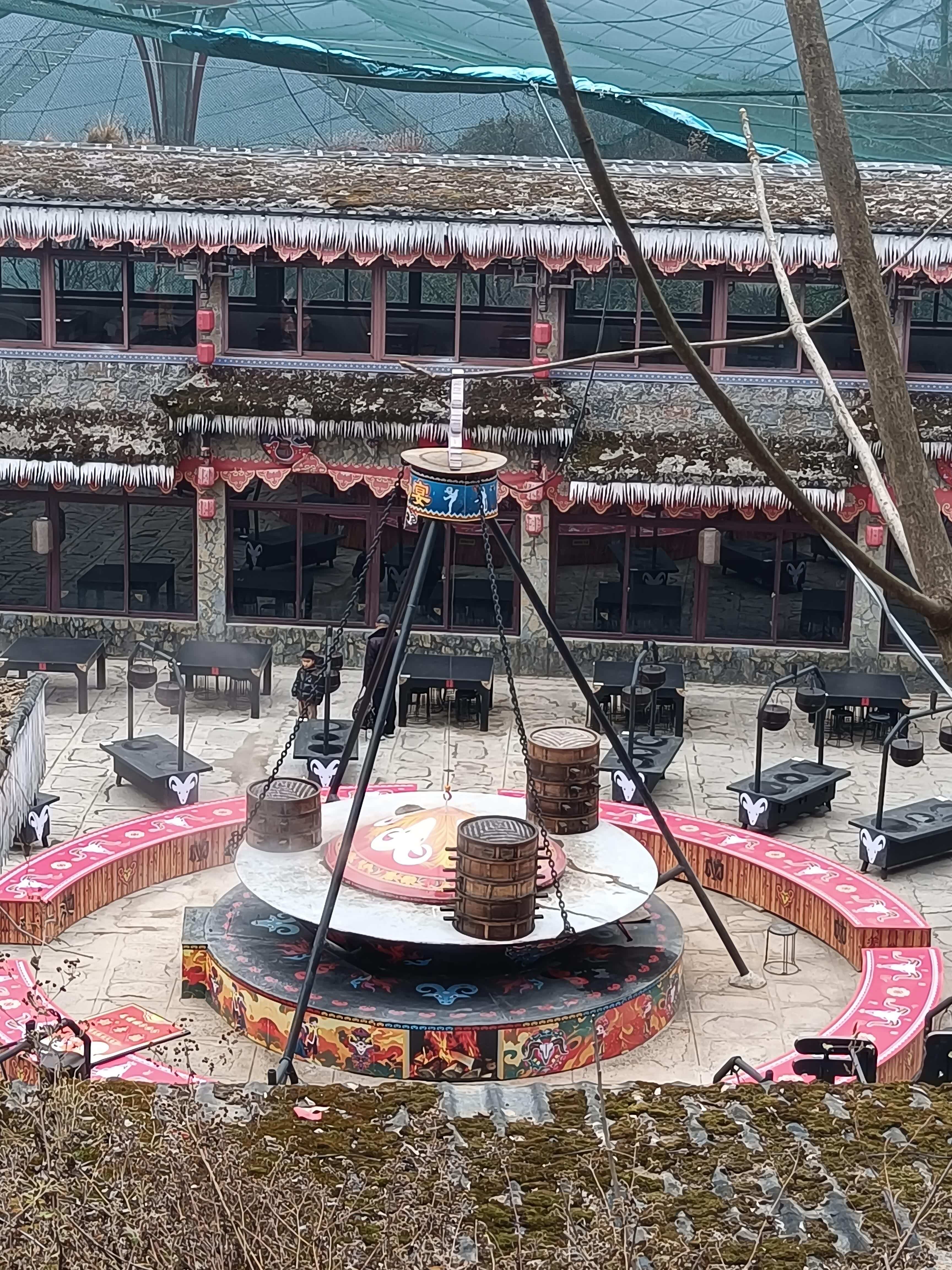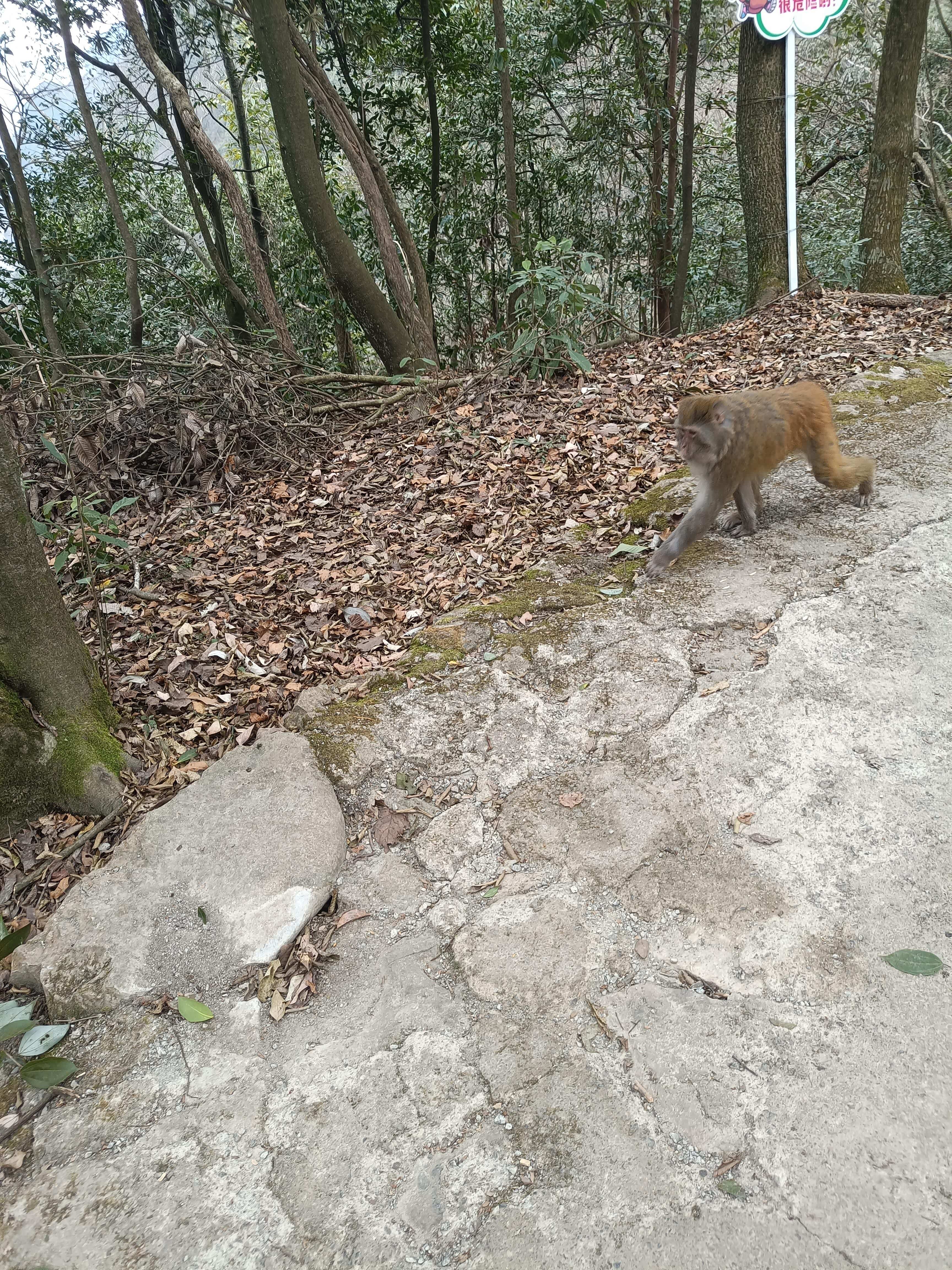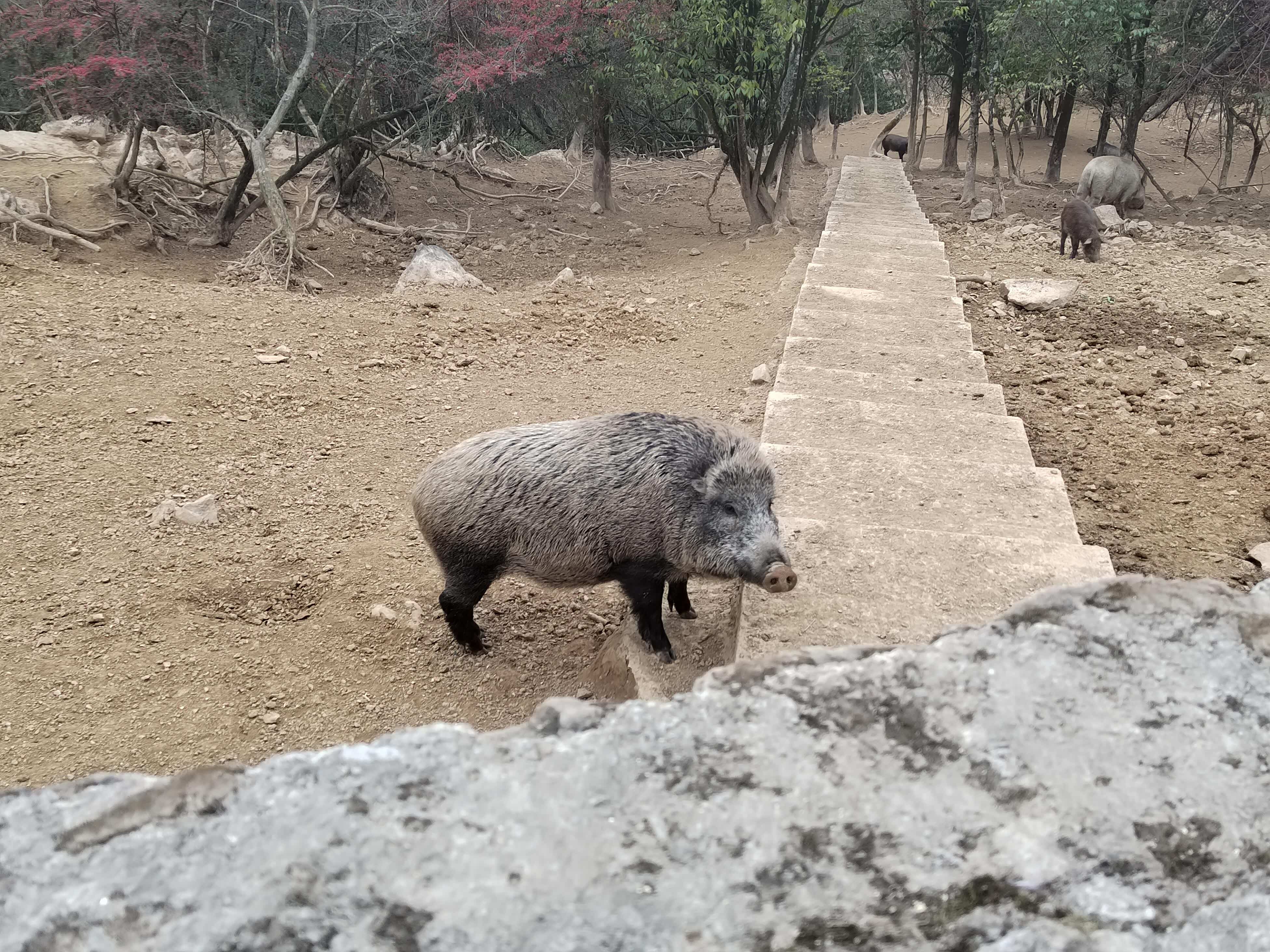 这一路真的是虐到极致,1500米的爬升不是盖的,每走一步都感觉腿不是自己的。途中还遇到了不少有趣的插曲,比如路边突然窜出来的猴子,一点都不怕人,看见我们手里的零食就围过来抢,吓得老婆赶紧把面包藏到包里。还有山里散养的猪猪,长着长长的獠牙,慢悠悠地从路边走过,看着有点吓人,但其实很温顺,只要不招惹它就没事。爬到中午的时候,景区还贴心地准备了刨汤宴!大块的肉炖得软烂入味,配着锅边馍馍,我们俩狼吞虎咽吃了个精光,这大概是爬山途中最幸福的时刻了。