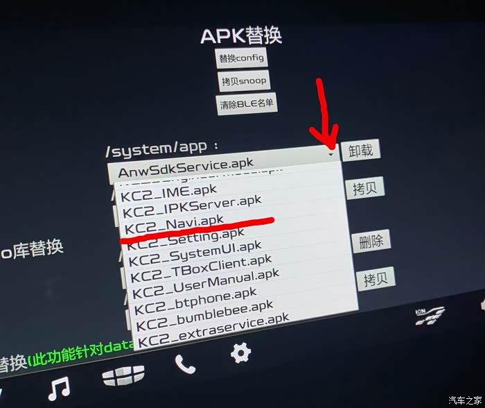 点一下箭头那里的下拉菜单,把KC2_Navi.apk,然后选择卸载。这个是车机自带的导航2.7版本,如果不删除,新的6.6高德导航是装不上的,有两个导航也会起冲突,所以删除。