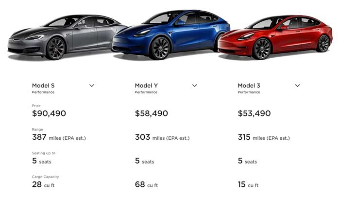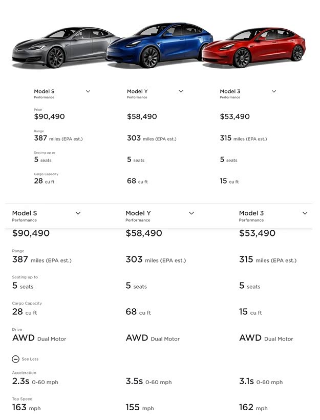 特斯拉现在在其网站上添加了一个新页面,您可以在其中执行此操作-允许您通过选择自己的规格一次最多比较三个车型。在比较页面上,您将立即看到车辆的所有主要特征:成本,范围,座位,负载能力,行驶,加速度和最高速度。