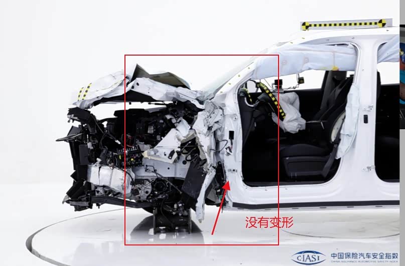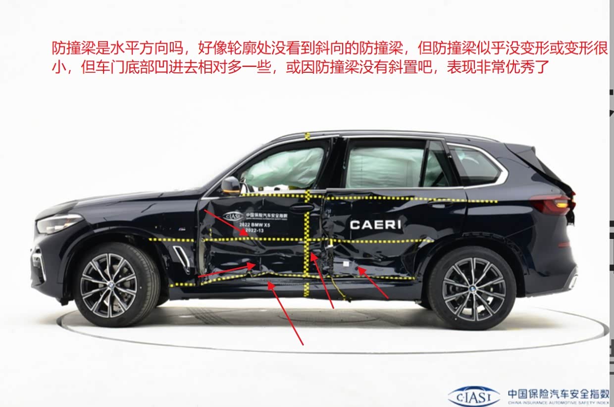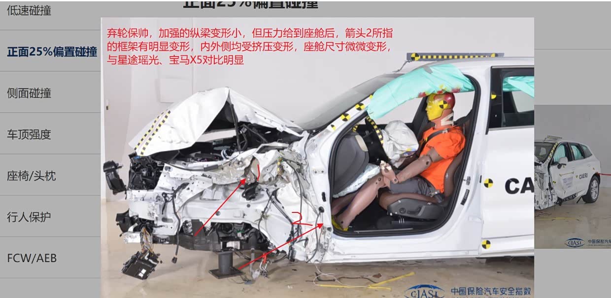 1、星途瑶光侧面防撞梁为斜置,有2根,下面的应该为主,上面的应该为辅,侧碰后侧面防撞梁没弯曲(仔细看图,车门略凹,但斜向的防撞梁应该就是没弯),B柱离座椅中心线距离25cm(中保研给出量化数据,直观易懂)。