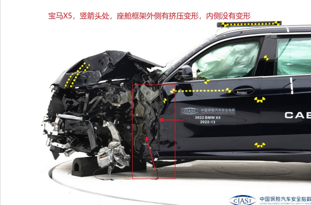 3、再看宝马X5,A柱无变形,但A柱下方的车门框架外侧有变形,但内侧无变形,还可以,但表现不如奔驰GLC和星途瑶光。