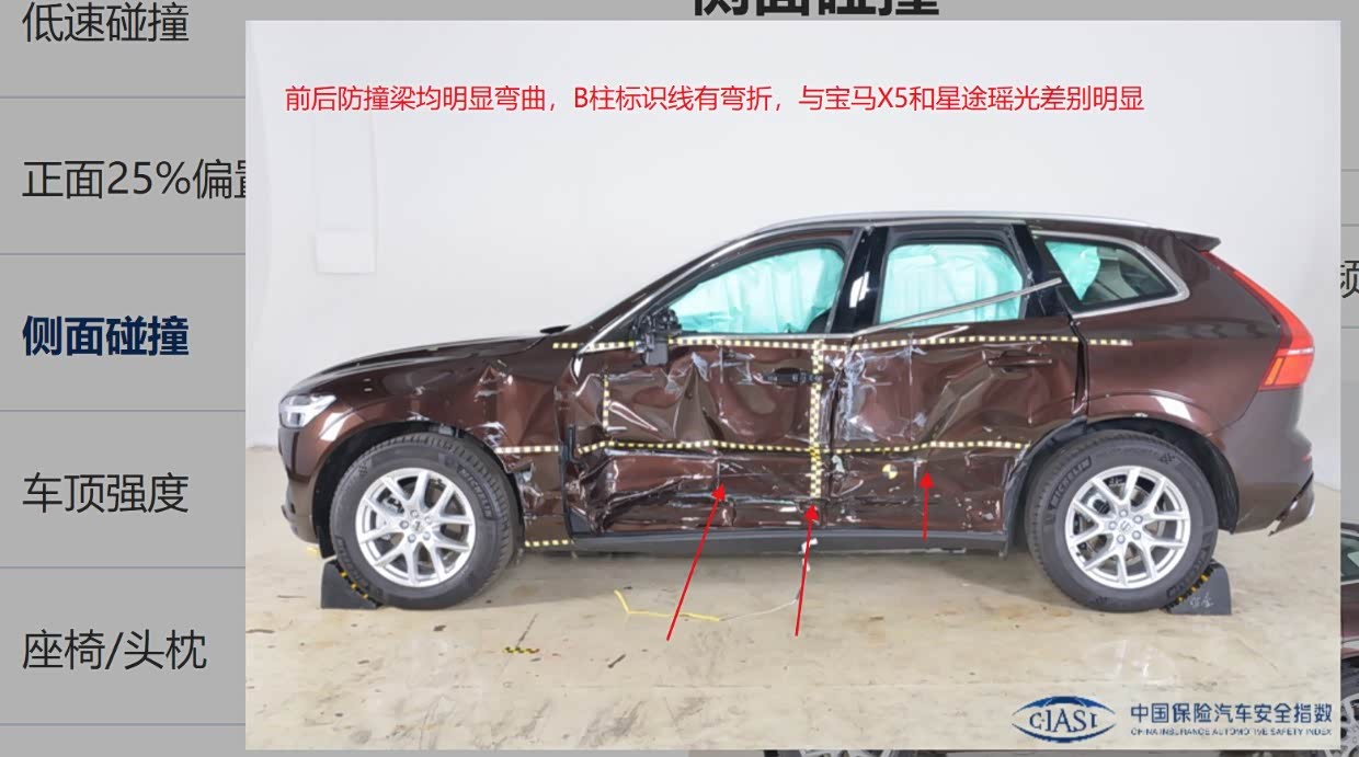 2、宝马X5和奔驰GLC的侧防撞梁为水平横置,沃尔沃XC60为斜置,宝马X5侧碰后,侧防撞梁基本没有弯曲,但车门底部凹进去比星途瑶光略多,B柱离座椅中心线距离25cm;
