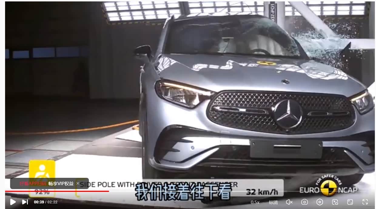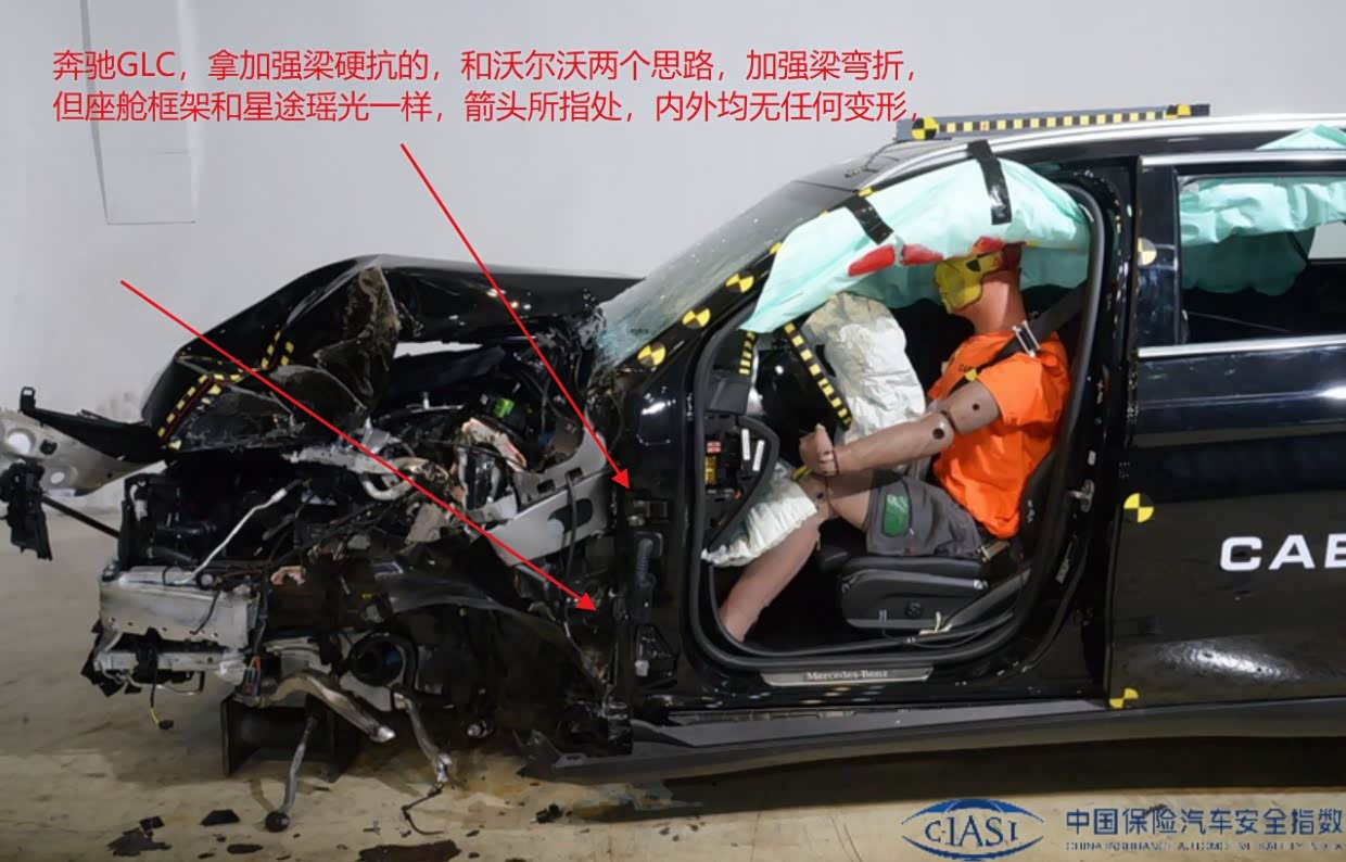 2、再看奔驰GLC,也是有一根专用的25%防碰撞加强纵梁,硬抗偏置撞击,A柱也没有变形,A柱下方的车门框架内外无任何变形,但玻璃碎裂程度较严重,说明加强的纵梁或强度弱于瑶光,或吸能弱于瑶光,车门框架抗变形能力也非常强,但碰撞过程中纵向吸能不如瑶光,属于硬汉硬抗型。