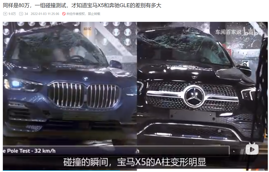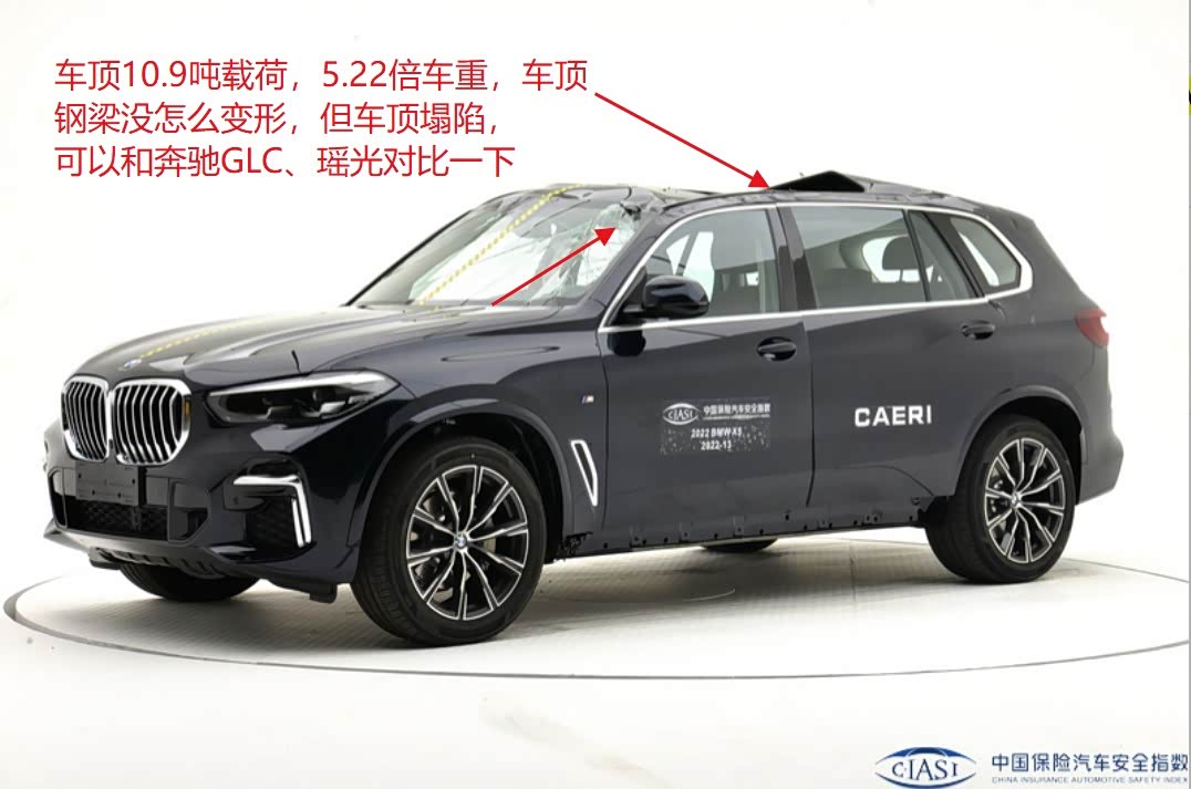 不过要指出的是,宝马X5的车顶在测试中内塌了,其它几款车均没有,这也与其柱碰明显落后于奔驰GLE的表现相符,对比奔驰GLE,同级别的宝马X5车顶强度和结构设计还有改进空间啊。