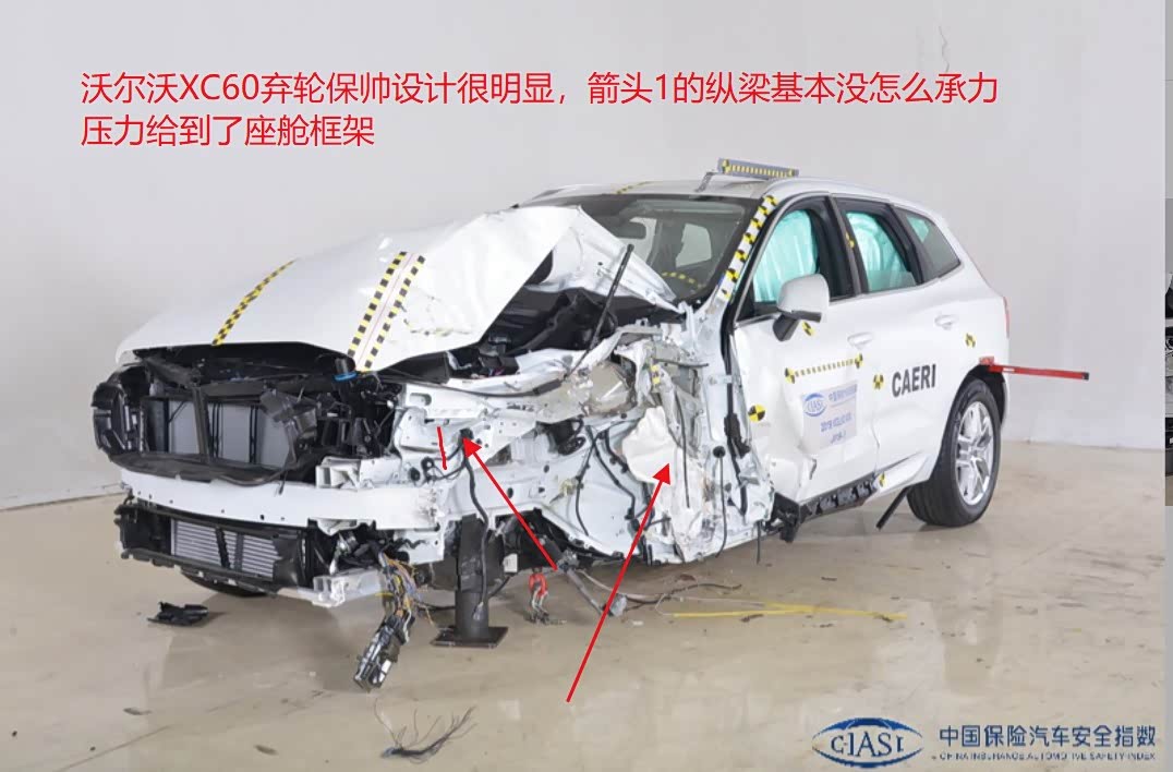 4、最后看沃尔沃XC60,设计思路与上面几款车不同,走的是弃轮保帅路线,但效果嘛,大家自己看图 吧,A柱没有变形,但A柱下方的车门框架有变形,且内外皆受到挤压变形,不如宝马X5,更比不过奔驰GLC和星途瑶光了。乘员保护效果和前面几款车比,大家可以自己体会,总归驾驶舱受到挤压不是件好事。另外测试报告说侧气帘保护范围不充分,这一点也不及星途瑶光、奔驰GLC、宝马X5。