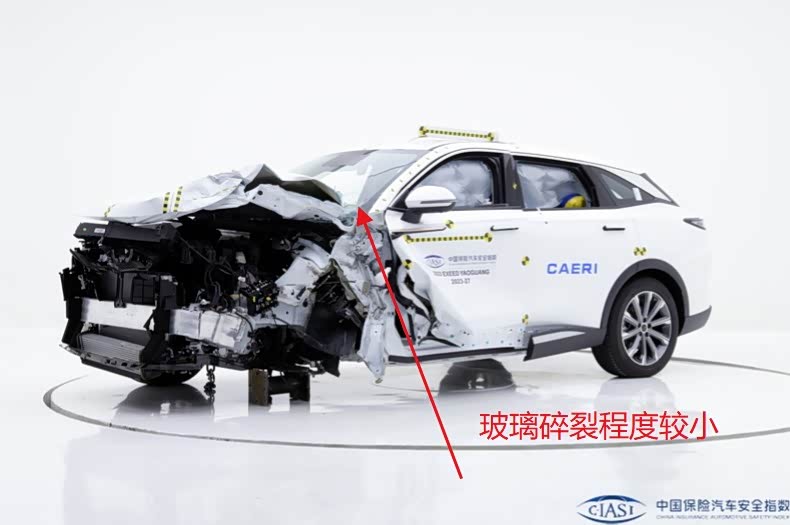 1、先看星途瑶光,厂家发布的车身结构图有一个25%碰撞专用的加纵向梁,还有些特殊的吸能设计,撞完之后,A柱没有变形,玻璃碎裂程度小,A柱下方的车门框架内外无任何变形,结合玻璃碎裂程度,车门框架抗变形能力非常强,而且碰撞过程中纵向吸能也不错。