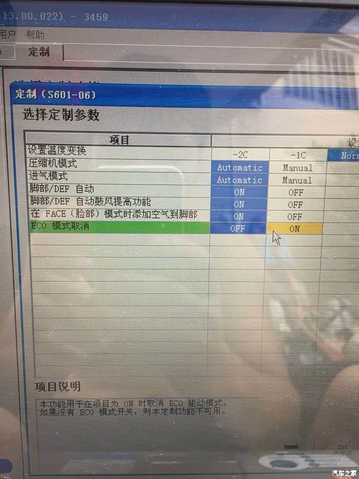 这个就是关闭ECO模式,选ON。不过这时候仪表上ECO指示灯还是亮的,不过模式已经失效,可以不理会。