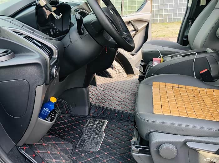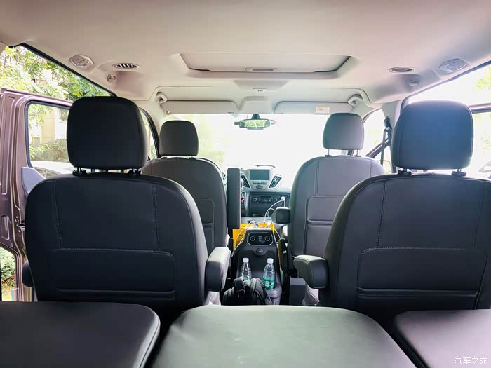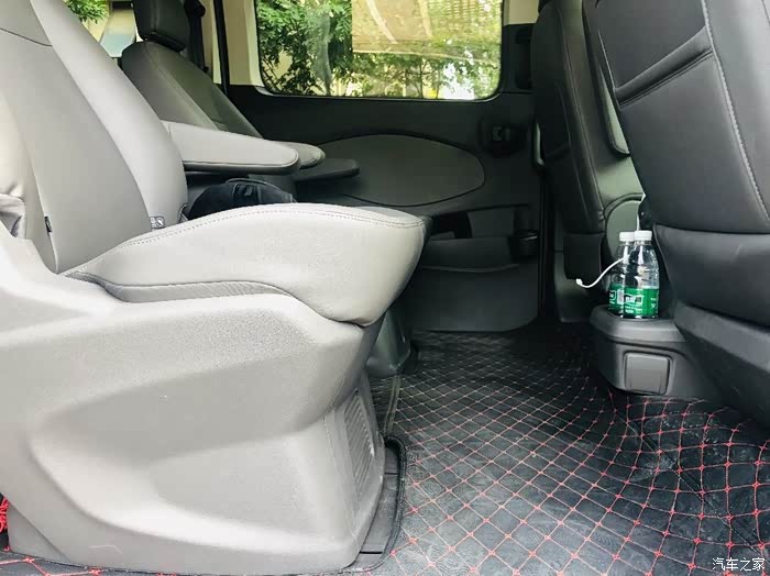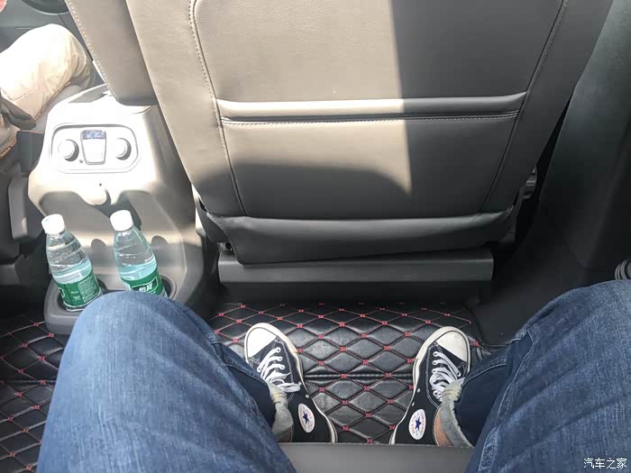 第二排是独立座椅带扶手,前排为纯平,下面还有两个水杯架,弯腰就能拿到。