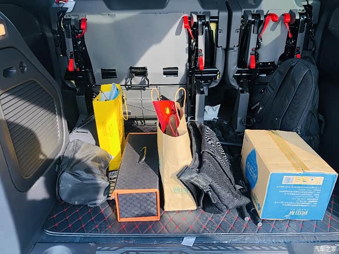 第三排只要双手扯红色的限位器,就能直接上翻,这比单纯放倒能空出更多储物空间,很灵活的设计。
