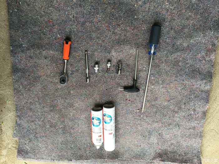 本次施工准备的工具:大一字螺丝刀,1/4棘轮扳手和加长杆、10mm套头、星型内六角、有个万向节用不上,两瓶清洗剂(实际上一瓶就足够)。清洗剂奶东买的16.8元一瓶