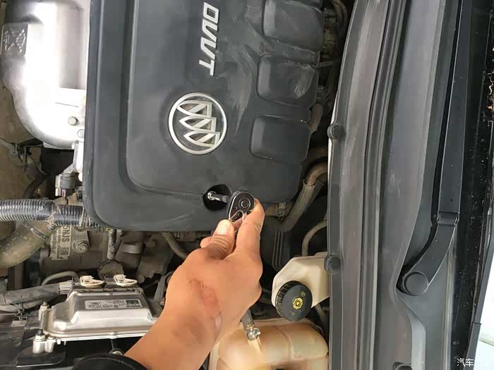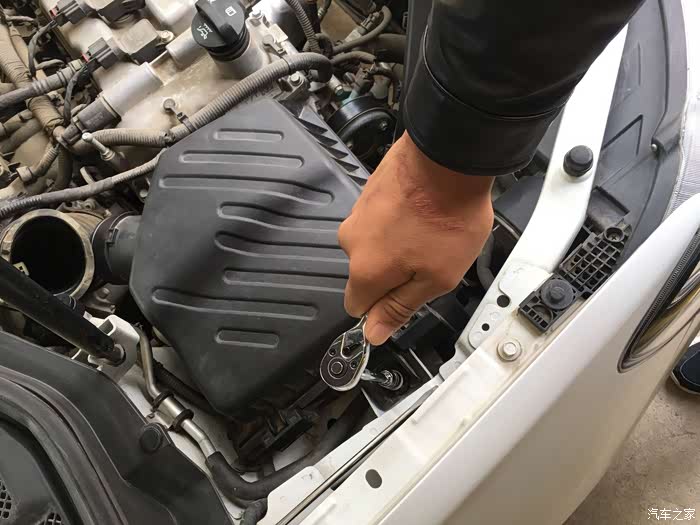 接下来施工空间不太够,所以需要拆掉空滤总成,右侧叶子板与空滤之间有颗螺丝,把它拆掉,然后总成就可以取下来了,活动活动看看,有两个卡扣,拽出来就行了