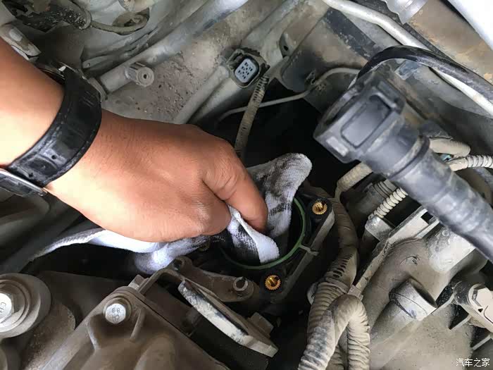 与节气门相对的,是进气歧管,摸一把看看这酸爽,这里边自己就别乱搞了,涉及发动机了,自己搞不了,用干净不掉毛的毛巾擦擦倒是可以的
