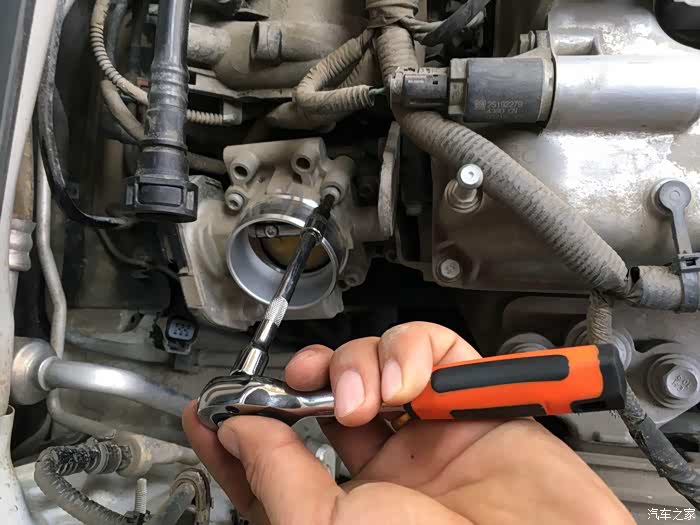 节气门上有4颗螺栓,用棘轮扳手加杆加星型内六角,依次卸掉四颗螺栓
