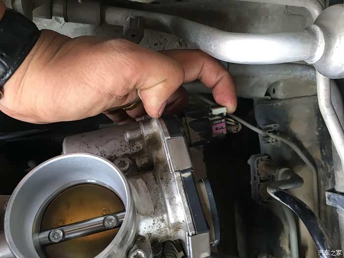 取下进气管,管子上还有一根线,这个不需要取下来,注意别使劲折线,把它放到一边,接下来拆一个难点,节气门上有一个插头,这个不太好拔,需要技巧,建议找一个相同的卡扣练练,下图这个卡扣练手