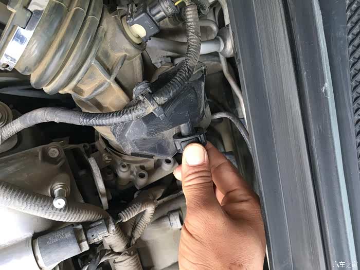 在发动机右边,机油滤芯上方,有一个跟节气门上一模一样的插头,插头上一个白色的卡子,一个紫色的卡子,紫色的不需要动,把白色的卡子往外拽,一点一点的拔出来,不需要拔下来,只需要拔出来,然后白色的卡子中间的位置有一个白色的点,用指甲盖往下按,然后往外拔,节气门那个操作空间小,用这个练练