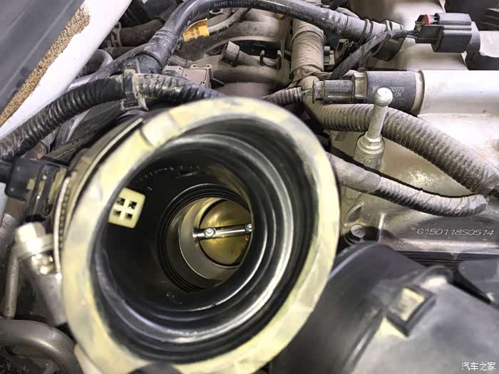 拆掉空气滤芯进气管,用一字螺丝刀松掉钢卡,就拿下来了,实在不会的话去看我更换空气滤芯教程,拆掉以后可以看到节气门(这边看不到脏,因为是另一面脏),确定是闭合状态,因为是电子节气门,停车熄火以后应该都是闭合状态,保险起见看一眼,如果不是闭合状态,去车上拧开车钥匙,是拧开车钥匙通电状态,踩几脚油门(这个是听别人讲的,我自己没有操作,全新英朗应该不需要)注意!不是打火!!!不是打火!!!不是打火!!!现在没有空滤,不能打火