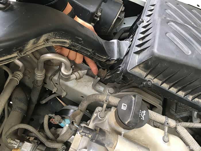 进气管上有这么一个卡扣,链接一个硬管,拆下来,两面各有一个按钮,同时按进去,活动活动拔出来,这里别暴力,这管子是硬管,怕折断了