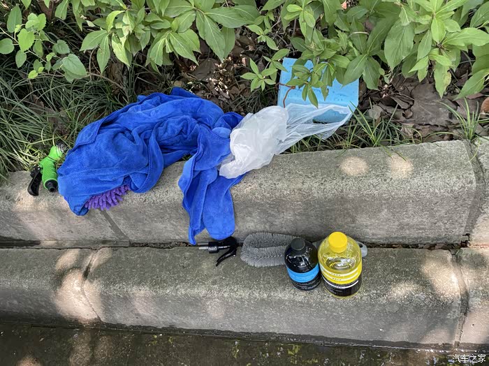 为了防止吸到泥沙,在泵头那端放个水桶。工欲善其事,必先利其器。毛刷、水蜡、毛巾、拖把、洗车手套一应俱全。这就叫专业.jpg。