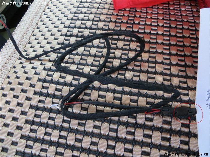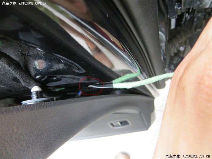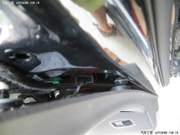 原车喇叭只有一跟短线就插在红圈这个扣上,只要伸进一个手指把卡扣摁一下,轻而易举就把喇叭线摘下来,所以不用把门把拆下来