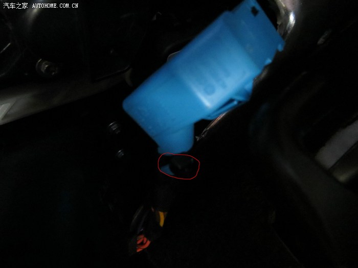 主驾驶侧,方向盘下面的塑料护板,上面有3个螺丝,红圈里是其中一个,用T20拧掉螺丝,黑窟窿是空调口,空调口的后面就是网关,有着蓝色的外壳