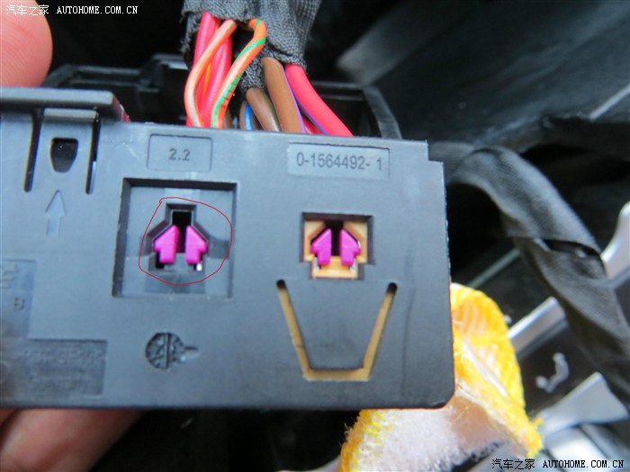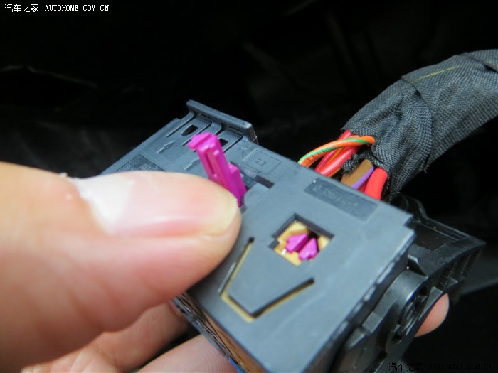 从蓝色外壳里拔出的网关,就是这黑东西,从箭头指的空里拔出10针和20针,上面有号码的。这个就好拔多了,因为他的回呛弹片是单侧的,而且还直接露在外面。镊子一摁,一拔线就出来了,只是这里面需要躺着举着手操作,不舒服。拔出的10针和20针,需要插进从上面垂下来的OPS线上的黑卡子里,插也有顺序的。红色线头侧插进20针退下的线,黑色线头侧插进10针退下的线,然后OPS线黑色卡子旁边还有两根线插进网关里退下针的那两个空里,红色的插20,黑色的插10.此时,下面需要连接的技术活完事