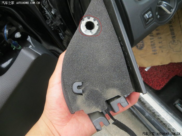 拆下来的原车喇叭,红圈里的白扣就是那个大固定扣,需要把它拽下来,重新按到车门上,不然买的丹拿不带这个扣