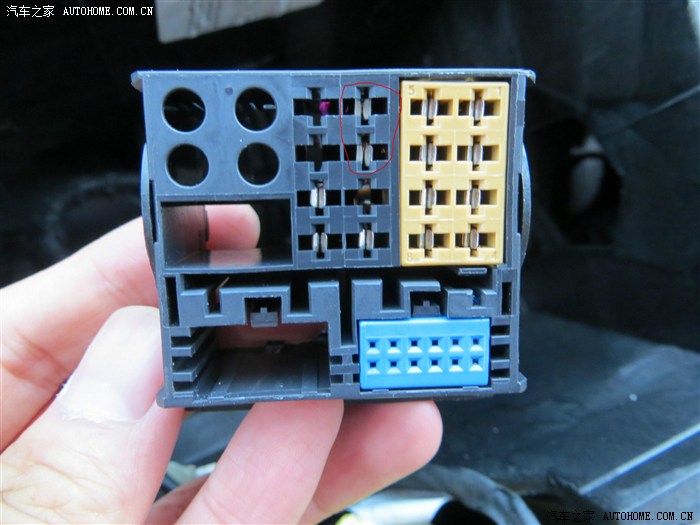 红圈里的就是机身标签图里说的9针和10针,就是要把它退下来,再把OPS链接线插上去。退下来的9针10针用胶布分别包好,别挨上。一会尖头镊子,就要从图片显示这一面竖直插进去,撬开针上两侧的小弹片。小弹片是回呛固定作用的,这就是最难的!!!窍门是:用尖头镊子,插进一边的小孔,一侧一侧的翘,另一只手在主线盒的另一端慢慢”持续“的拽对应的线,一般成功退掉一侧的小弹片时会有轻轻的咔的一声,别把镊子两头一起插进两边的小孔里,不好弄。这块最好两个人一起弄,会很快很简单!两个人一起弄,一个人拽线,另一个人拿着主线盒用镊子摁小弹片。2,3分钟也许把最难的这块就弄好了,我一个人弄弄了1个小时甚至更久!!