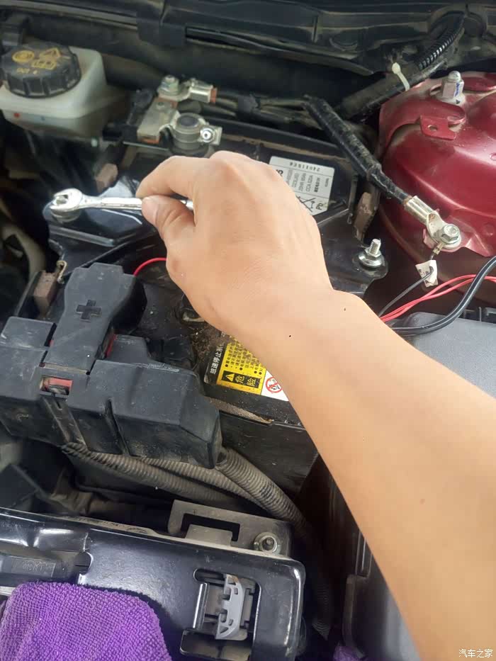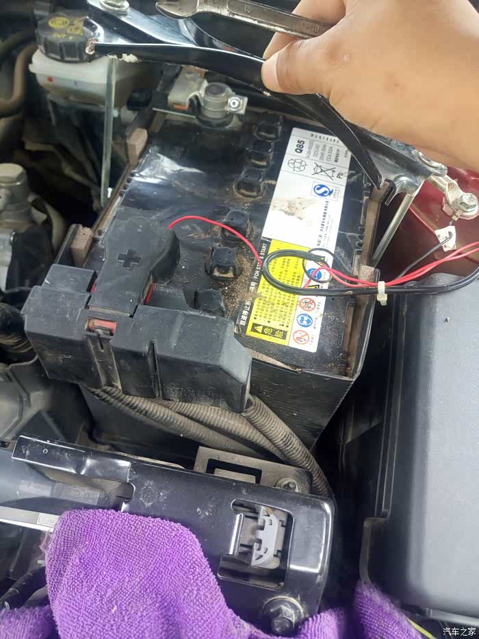 有条件的可以用扳手把电瓶的固定架子拆下,便于更深度的清洁。红色的电源线是我自己加装的分体电子狗,雷达装在进气格栅那里。