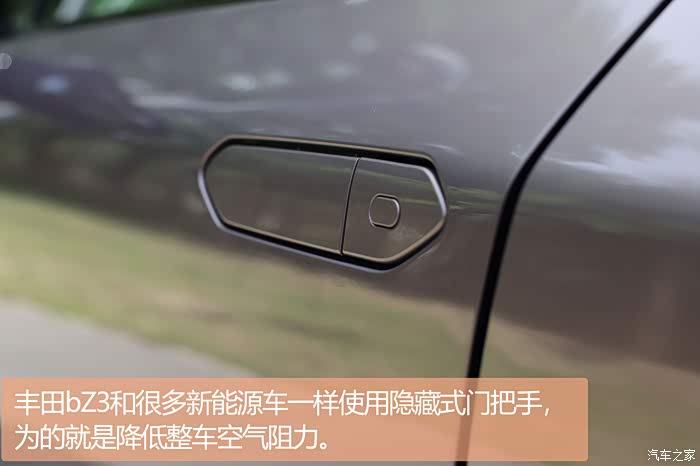 丰田bZ3和很多新能源车一样使用了隐藏式门把手,为的就是降低整车空气阻力,风阻系数更是低到了0.218Cd,非常惊人。但要说这个隐藏式门把手好不好用,我这里打个问号,可能是我开启方式不对,总会被夹到手指...既然聊到了风阻系数,丰田bZ3上还有一些设计巧思,我们值得了解。和bZ4X一样,丰田bZ3前脸也采用了标志性的垂头鲨造型,加上引擎盖两侧凸起的造型以及包围两侧夸张的导流槽造型,具有较为强烈的视觉冲击力。