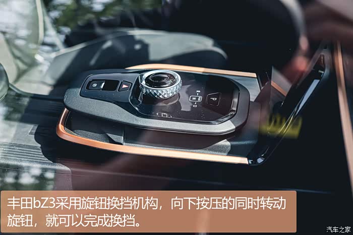 丰田bZ3内饰采用独特的"DIGITAL ISLAND(数字岛)"设计,在这个设计中心是旋钮换挡机构,向下按压的同时转动旋钮,就可以完成换挡。哦,对了丰田bZ3是我见过为数不多还带有物理启动按键的BEV车型,相比很多新势力车型那种坐上驾驶位深踩刹车就上电的逻辑不同,或许这就是传统车企造车的特点吧。