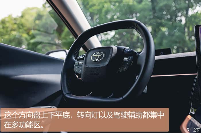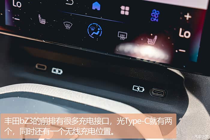 丰田bZ3的设计师在车辆的侧面运用了非常多看起来很立体的设计,让阳光照射在车身时产生的光影把车辆衬得很有机甲的感觉,从而起到了增强气势的作用。外观基本看完,我们在补充一点内饰细节,我们只说亮点。丰田bZ3的前排有很多充电接口,光Type-C就有两个,同时还有一个无线充电位置。方向盘上方的红外摄像头用来监控驾驶员的面部表情,预防驾驶员因疲劳驾驶酿成车祸,但是这个摄像头好像会因为方向盘的转动完全挡住,这真的没有关系么?