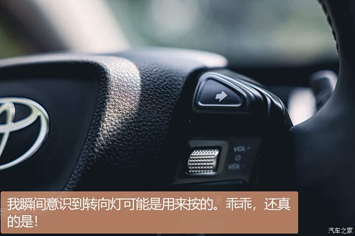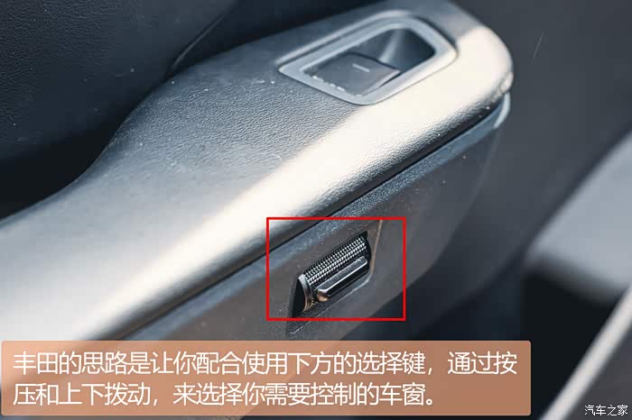 更有意思的是这个车窗控制按键,可以说是简化到了极致,因为在主驾驶位你看不到四个车窗控制键,丰田的思路是让你配合使用下方的选择键,通过按压和上下拨动,来选择你需要控制的车窗,具体控制哪一个会在仪表盘左边显示。